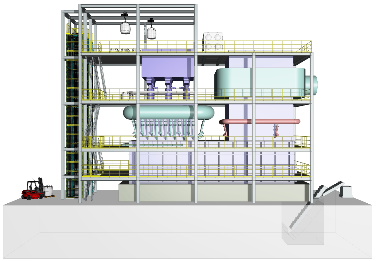 SRF氣化焚燒爐采用設(shè)置立式U型結(jié)構(gòu),進料口在焚燒爐位于窯頭上方的氣化反應(yīng)塔頂部,由輸送裝置將SRF經(jīng)雙鐘罩密封進料送入爐內(nèi);煙氣出口在焚燒爐位于窯尾上方的上升煙道出口,助燃風(fēng)進口位于反應(yīng)塔中下部、熔池和上升煙道處,將SRF燃燼、熔融。