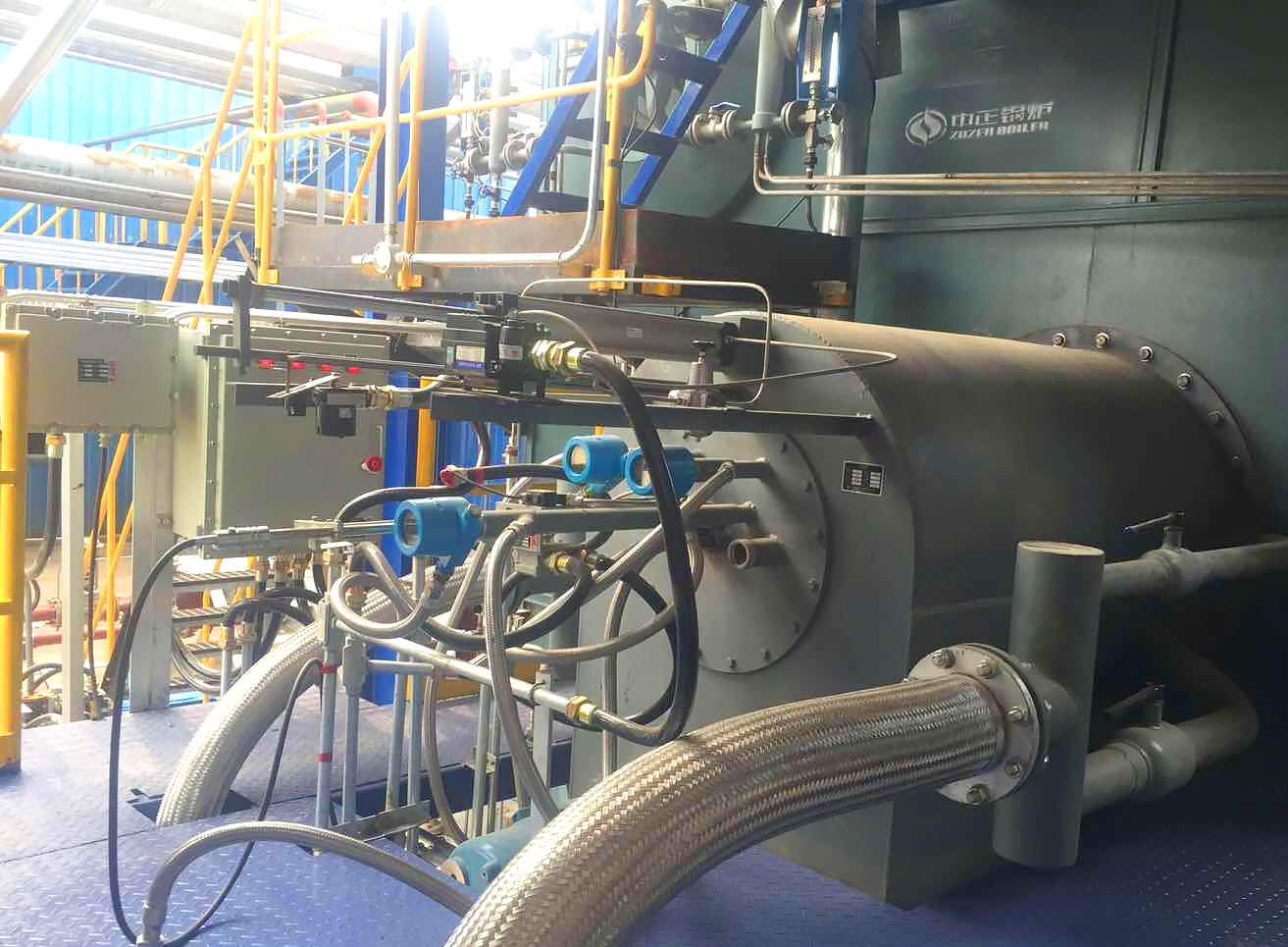 濰坊某石化企業(yè),原有一臺(tái)20t臥式蒸汽爐,燃料為富氫氣,工藝線產(chǎn)出沼氣直接通過地面火炬燃燒,造成資源的浪費(fèi)。我公司根據(jù)鍋爐參數(shù)與燃料參數(shù),定制化設(shè)計(jì)一套混燒燃燒器系統(tǒng),兩種燃?xì)猓ǜ粴錃?、沼氣)可同時(shí)進(jìn)行混燒或單燒,同時(shí)配置一套全新沼氣閥組與控制系統(tǒng),經(jīng)我方工程師調(diào)試后,燃燒器運(yùn)行平穩(wěn),滿足用戶兩種燃?xì)饣鞜募夹g(shù)要求。
